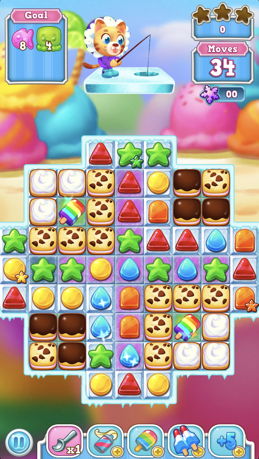 Ice Cream offered a lot of visual possibilities for pieces. We explored and slowly worked them down to simple shapes. The puzzles in Frozen were the basis of all future storm8 puzzle mechanics